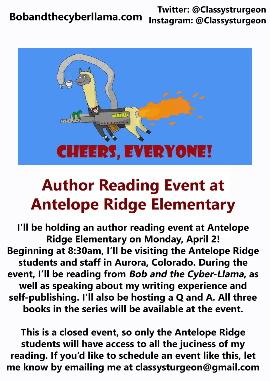 From 12:00pm to 1:00pm, I’ll be visiting the fine folks at Sable Elementary in Aurora, Colorado, for an author visitation and reading event. During the event, I’ll be reading a short passage from Bob and the Cyber-Llama, as well as speaking about my writing experience and self-publishing. I’ll also be hosting a Q and A. All three books in the series will be available at the event.